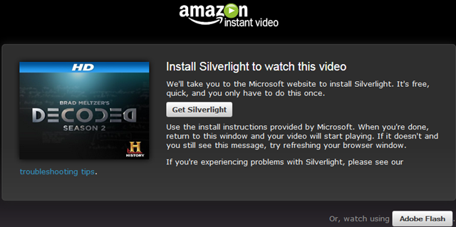 You can also go into the browser and disable the Silverlight Plugin. Movies will then playback in Flash rather than Silverlight. I didn’t try this one, but it might not be a bad idea since Silverlight is a completely dead technology. I had Silverlight installed because of the 2013 Tour de France and just never made any chances because Amazon worked.