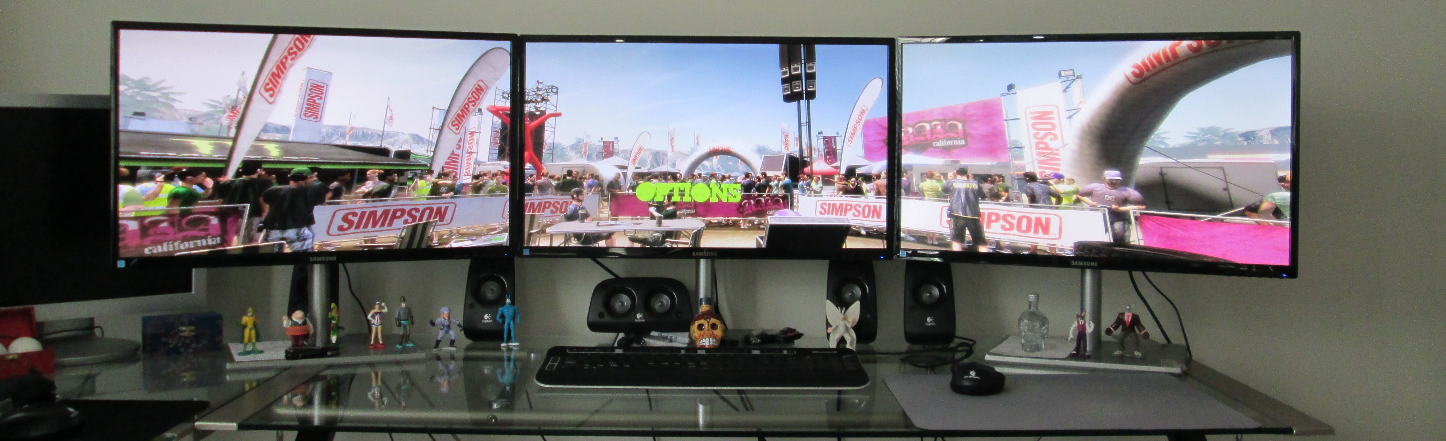 Let me present my Triple Monitor setup for Dirt 2. What you see are 3 of my 27 inch Samsung monitors together side by side. This is powered by my AMD FX 8350 CPU with 2 Nvidia GTX 660 Superclock GPUs in SLI.