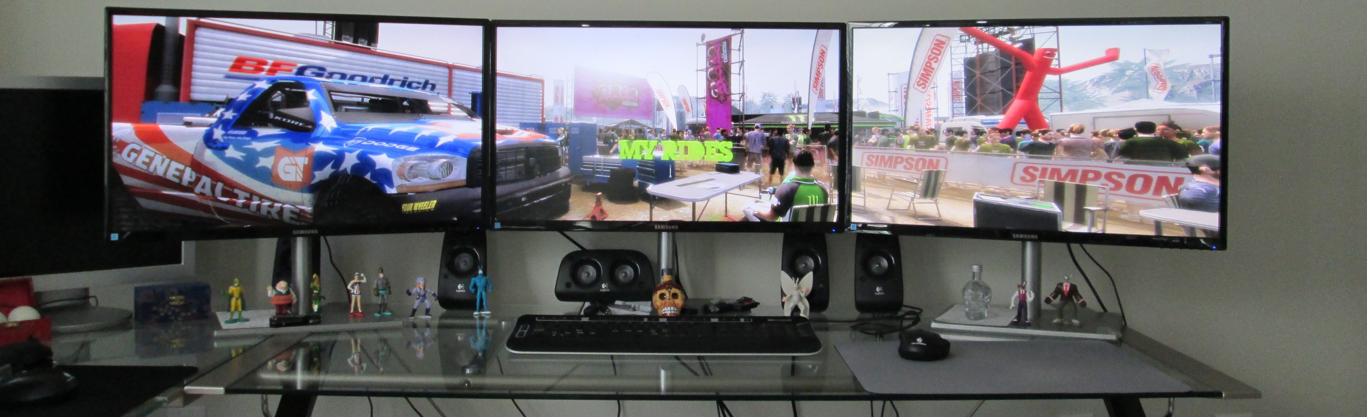 Capturing video of racing around the stages wasn’t quite enough for me. I wanted to go big. I’ve seen YouTube videos of games with 2 and 3 monitors put together and saw one for Dirt 2. So then I said to myself, "hey, I’ve got plenty of monitors sitting, why don’t I put that together and see what it looks like? So I did.